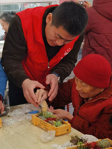 在现代科技展示后,随机而来的是“共植多肉,绿满心田”环节,将活动的温馨与绿意延续。我们特别准备了轻便易用的适老化园艺工具套装,长者们兴致勃勃地挑选自己心仪的多肉品种,在各位志愿者与工作人员的指导、协助下共同完成了填土、栽种、铺面、装饰。大家一边互相交流种植心得,一边欢声笑语不断。不一会儿,一盆盆形态各异、生机勃勃的多肉盆栽便在长者们手中诞生,为他们的生活空间增添了盎然绿意与情趣。肥厚饱满,错落有致的多肉,像一团团凝固的晚霞,承载着最温馨的陪伴,是岁月静好最生动的注脚。